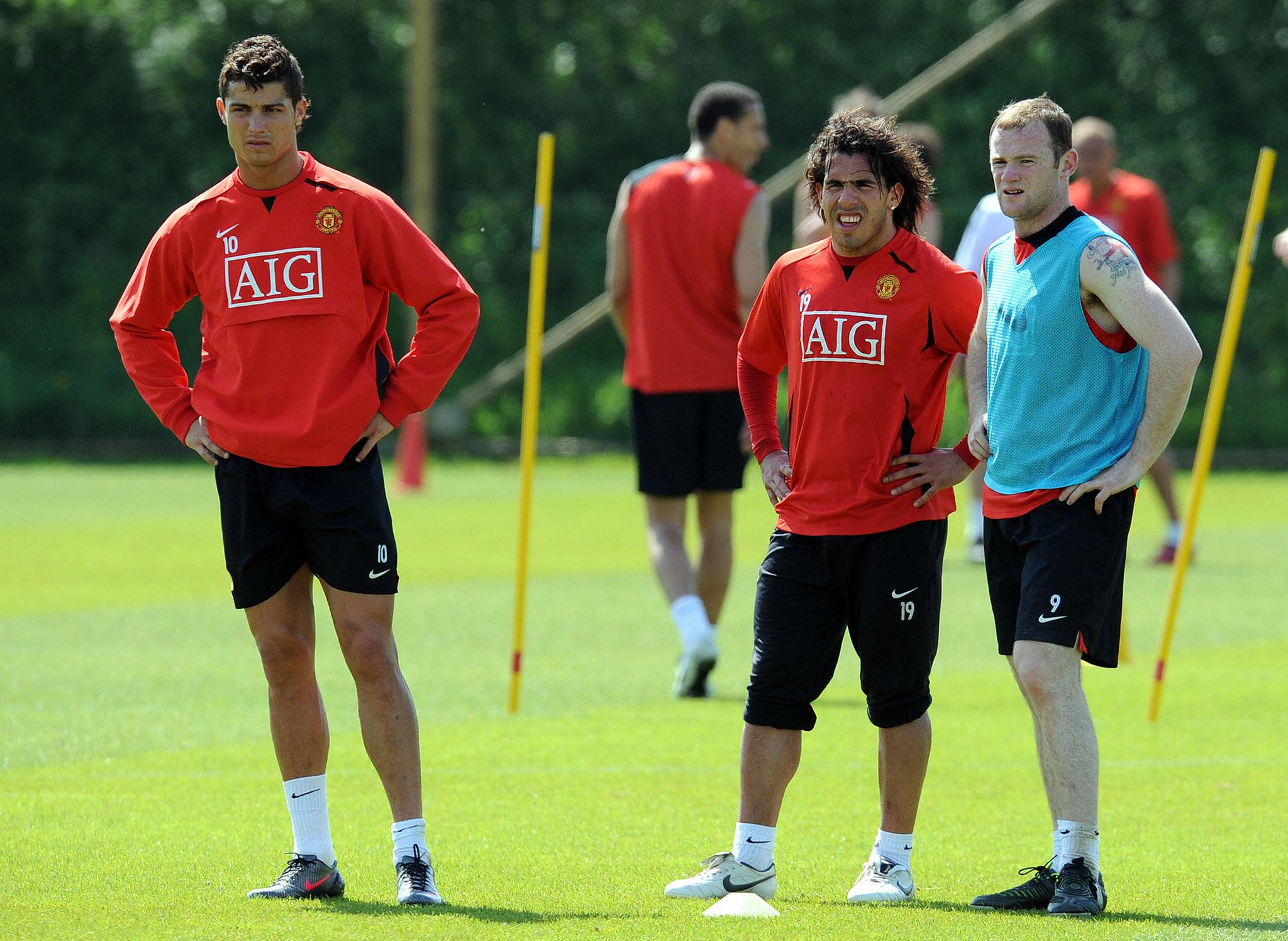L-R Cristiano Ronaldo , Carlos Tevez and Wayne Rooney during a Manchester United training session. Guess they've grown apart from each other now as Ronaldo plays for Spanish giants Real Madrid